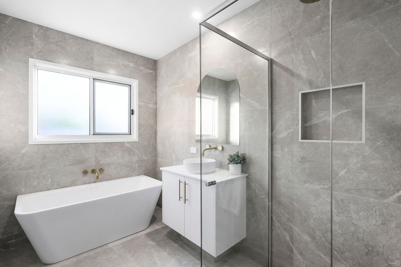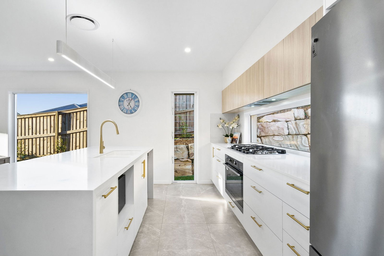 A Culinary Oasis: The kitchen is a culinary dream, featuring a large island bench with chic waterfall edges and trendy gold fixtures. With an expansive window splashback drawing in natural light, this kitchen is both functional and inviting—a true centerpiece for lifestyle living.